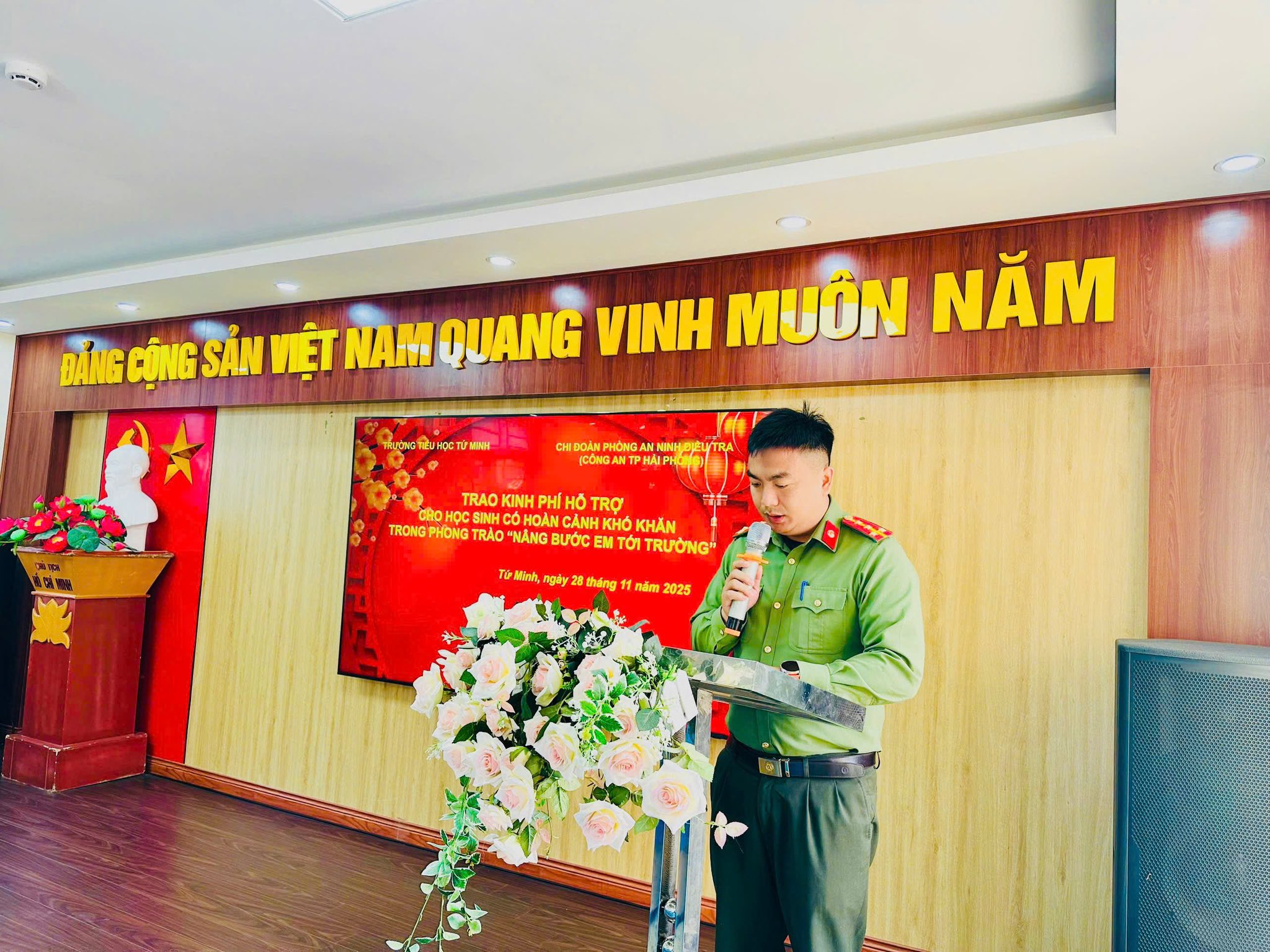 Chi đoàn phòng an ninh điều tra- Công an TP Hải Phòng trao kinh phí hỗ trợ học sinh có hoàn cảnh khó khăn của trường tiểu học Tứ Minh trong chương trình " Nâng bước em tới trường"