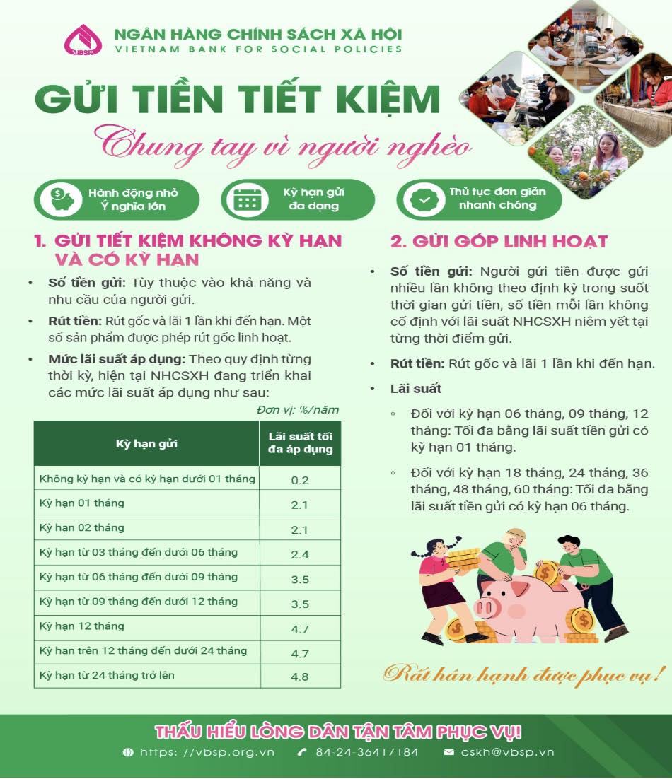 Việc gửi tiết kiệm tại NHCSXH không chỉ mang lại lợi ích kinh tế cho người gửi mà còn mang ý nghĩa nhân văn sâu sắc, thể hiện sự đồng hành cùng Chính phủ trong công cuộc giảm nghèo, bảo đảm an sinh và ổn định xã hội. Các hình thức gửi tiết kiệm tại Phòng giao dịch NHCSXH Cẩm Giàng: Tiết kiệm không kỳ hạn; Tiết kiệm có kỳ hạn; Tiết kiệm gửi góp linh hoạt