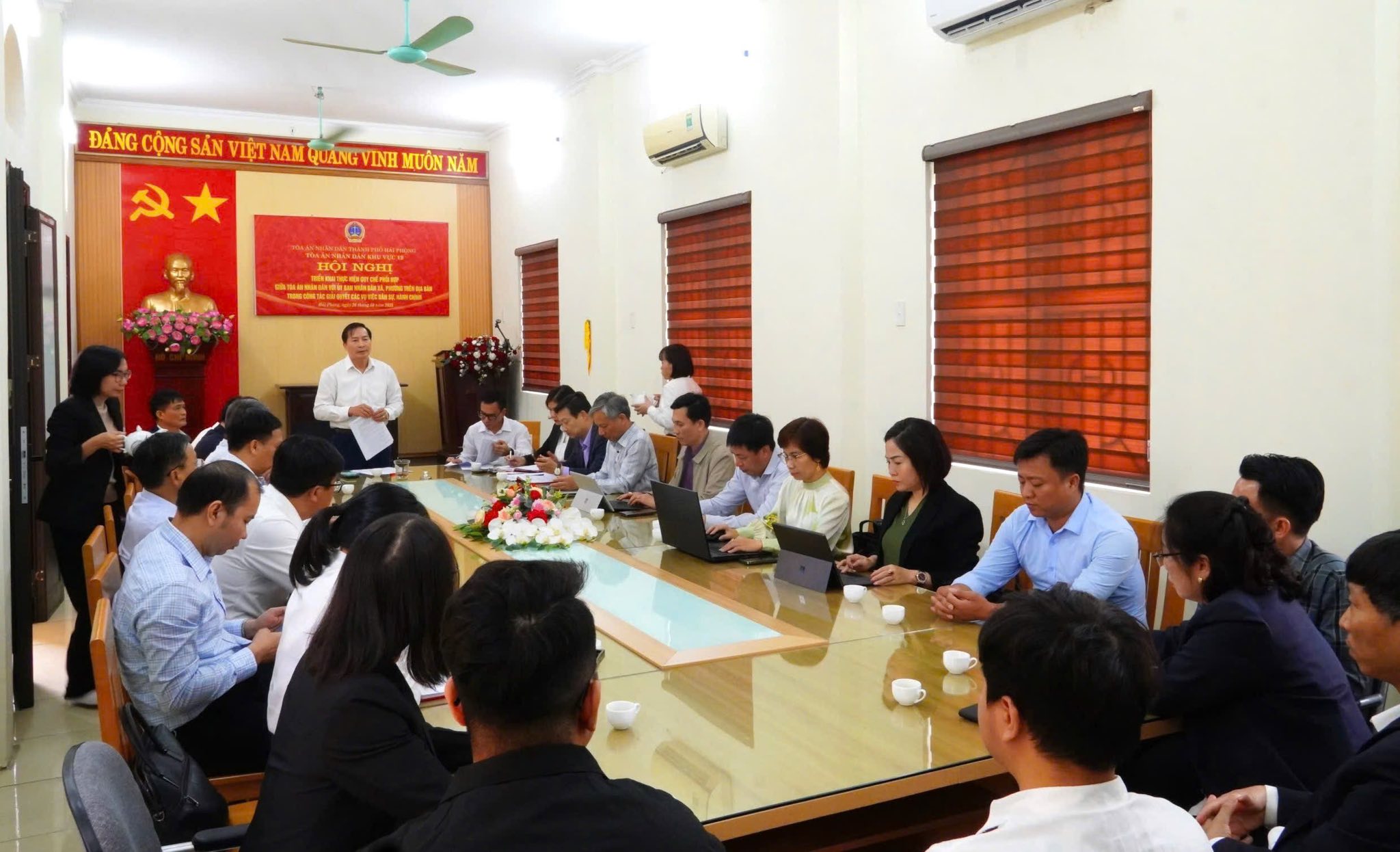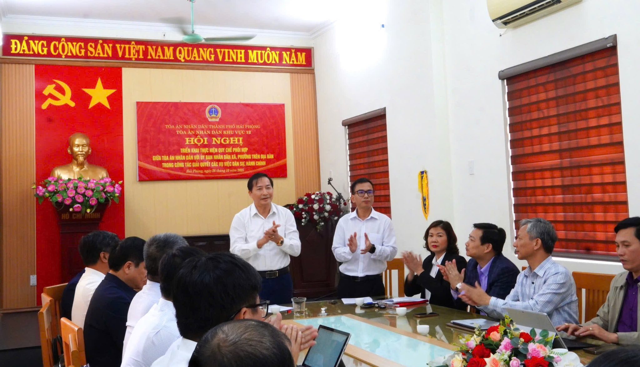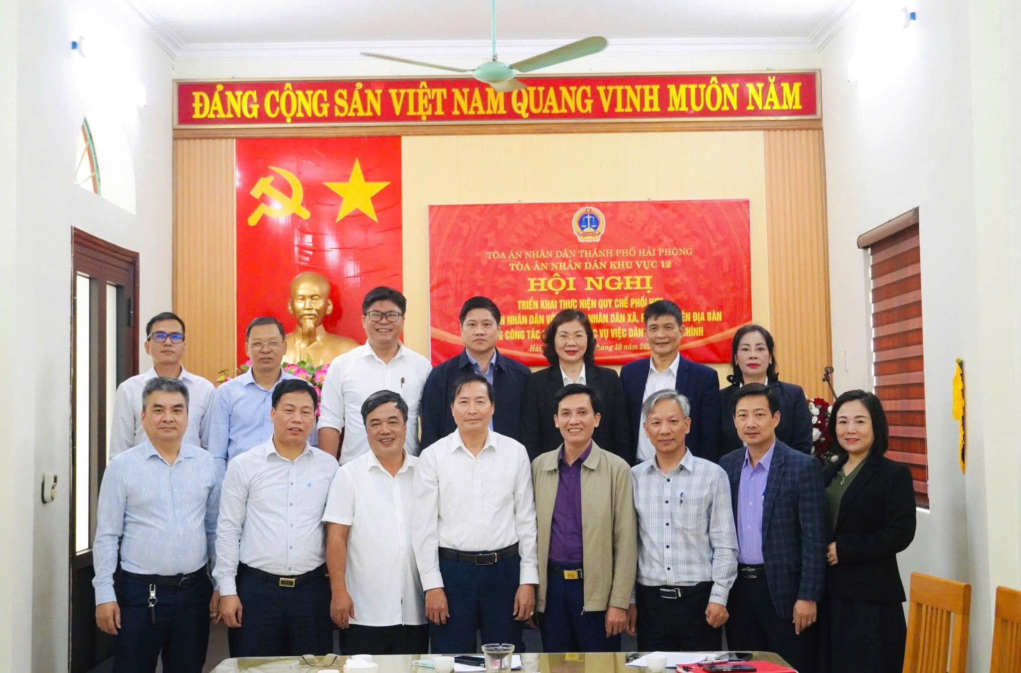 Sáng ngày 26/10, Tòa án nhân dân khu vực 12 – Hải Phòng đã tổ chức Hội nghị triển khai Quy chế phối hợp giữa Tòa án nhân dân khu vực và UBND các xã, phường trên địa bàn trong công tác giải quyết các vụ việc dân sự, hành chính. Dự và chỉ đạo đồng chí Nguyễn Văn Chất, Phó Chánh án Toà án Nhân dân thành phố Hải Phòng.