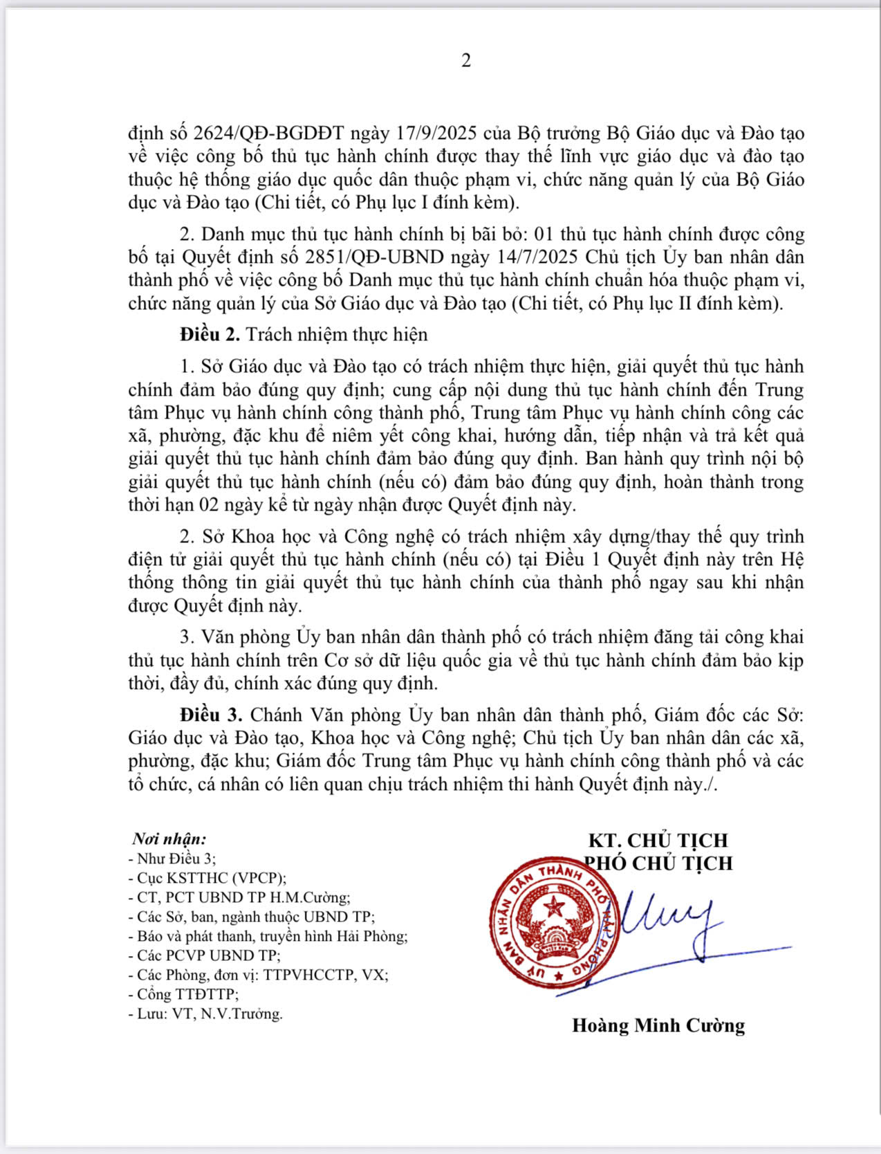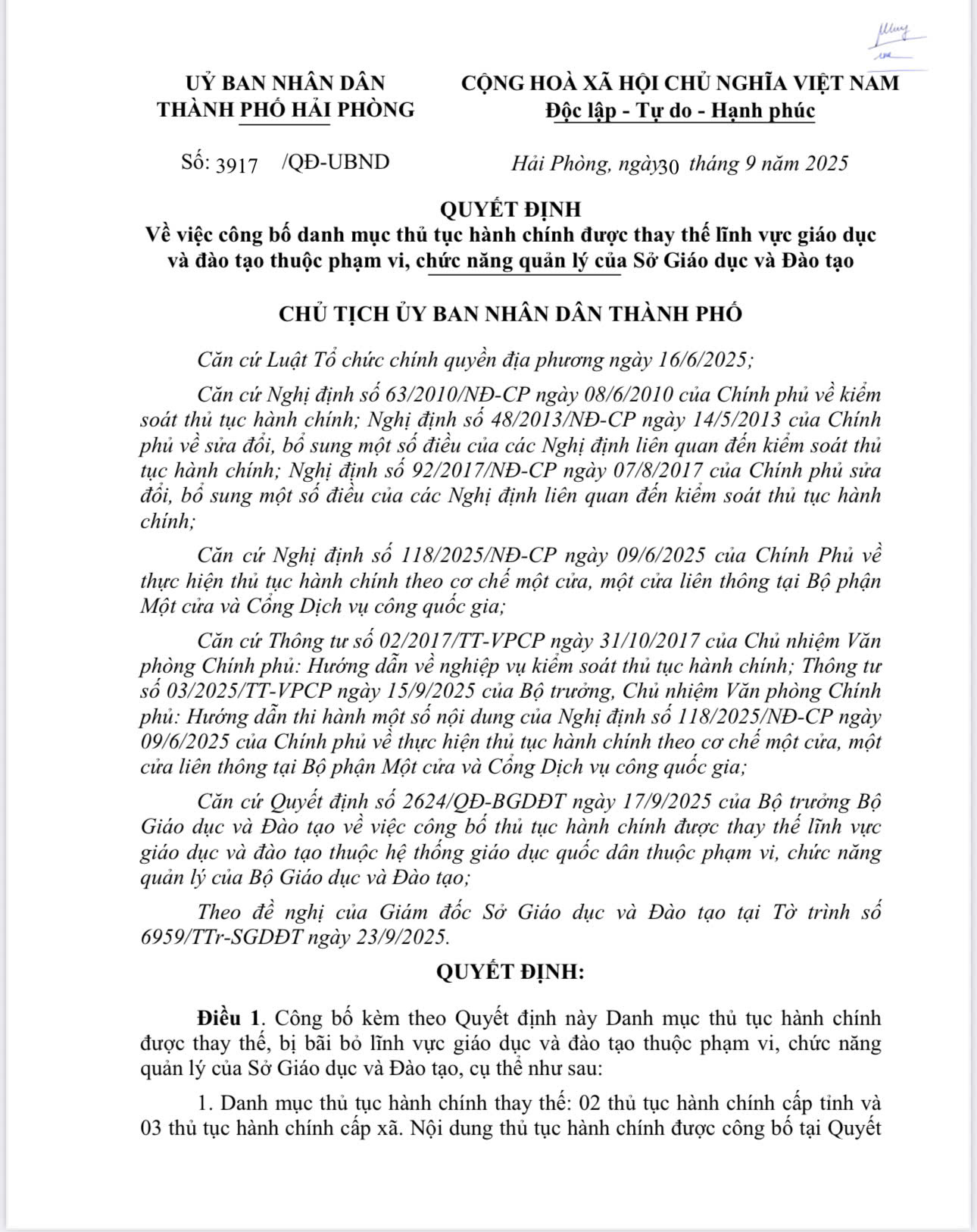 UBND TP. Hải Phòng ban hành Quyết định công bố danh mục thủ tục hành chính được thay thế lĩnh vực giáo dục và đào tạo thuộc phạm vi, chức năng quản lý của Sở Giáo dục và Đào tạo